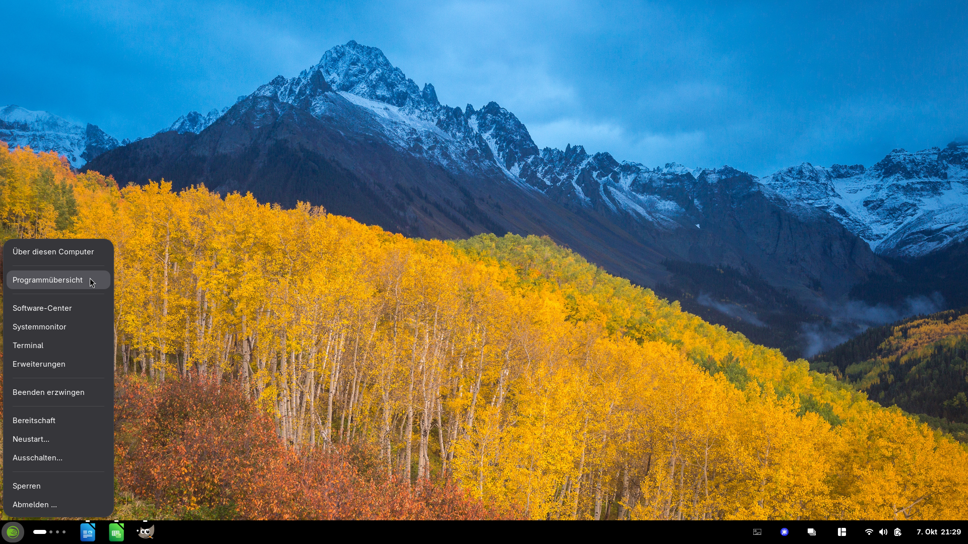 Links oben ist bei mir der Linux Pinguin (Tux heißt er), wenn man da draufdrückt, hat man alle wichtigen Sachen bei der Hand. Logo Menu